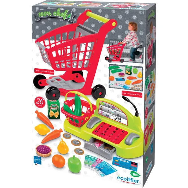 Le chariot de 41,5 cm de hauteur est parfait pour permettre aux enfants de s’immerger dans leur propre univers de courses. Il comprend une caisse enregistreuse mécanique avec un tiroir rempli de pièces et de billets, ainsi qu’un lecteur de codes, un téléphone, un clavier souple, un micro et un panier rempli d’accessoires. au total, ce sont 26 pièces qui sont à leur disposition pour stimuler leur imagination.