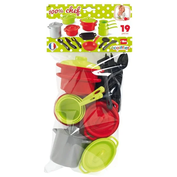 Une batterie de casseroles comprenant un marmite, 2 cocottes façon fonte, un cuit vapeur, une série de 3 casseroles à queue, une poêle, un plat à gratin et pour les accompagner, un écumoire, une spatule et un ensemble fourchette, couteau et cuillère de service.