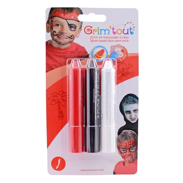 Grim’Tout est un maquillage à l’eau spécialement conçu pour la peau délicate des enfants, de qualité professionnelle et conforme aux normes cosmétiques.; sans parfum, et sans parabène. 3 sticks de maquillage.