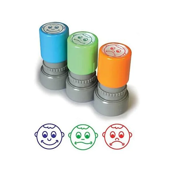 Un kit de tampons à encrage automatique qui permettra aux enseignants d’encourager et d’évaluer le travail des jeunes élèves en douceur. Le diamètre d’empreinte de 20mm sera idéal dans toutes les situations d’évaluation (exercices, dessin, écriture, etc…) 1 tampon automatique encré bleu avec l’empreinte d’un smiley content pour noter un travail satisfaisant. 1 tampon automatique encré vert avec l’empreinte d’un smiley moyennement content pour noter un travail moyen. 1 tampon automatique encré rouge avec l’empreinte d’un smiley pas content pour noter un travail insatisfaisant. Dimensions : tampons Ø 32 x 62 mm / Empreinte Ø 20 mm.
