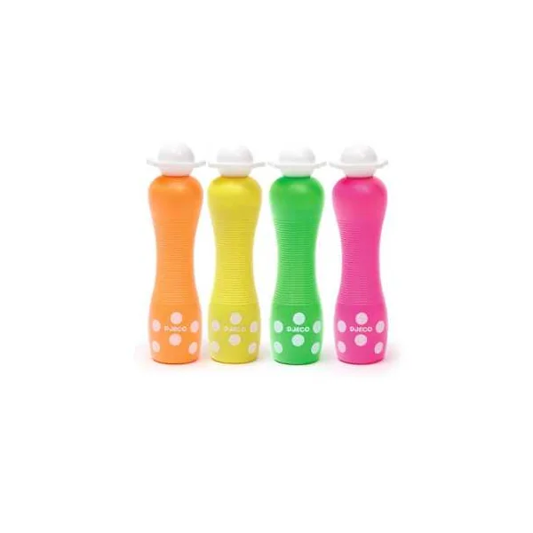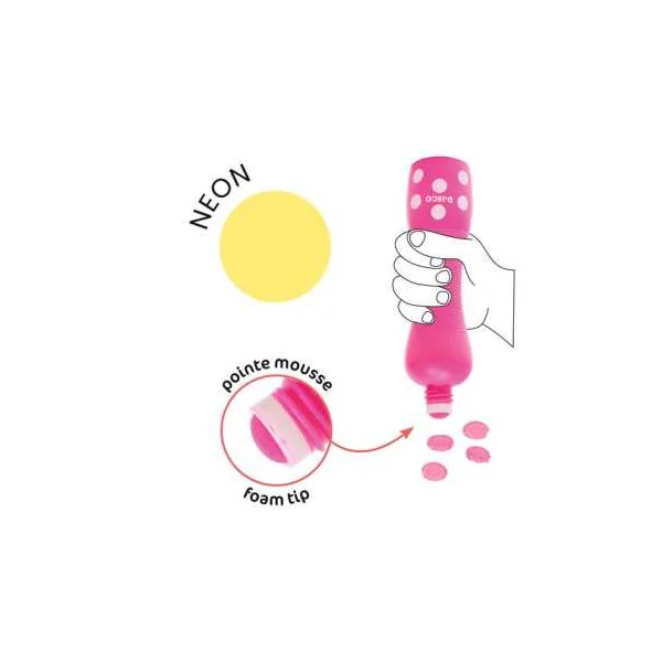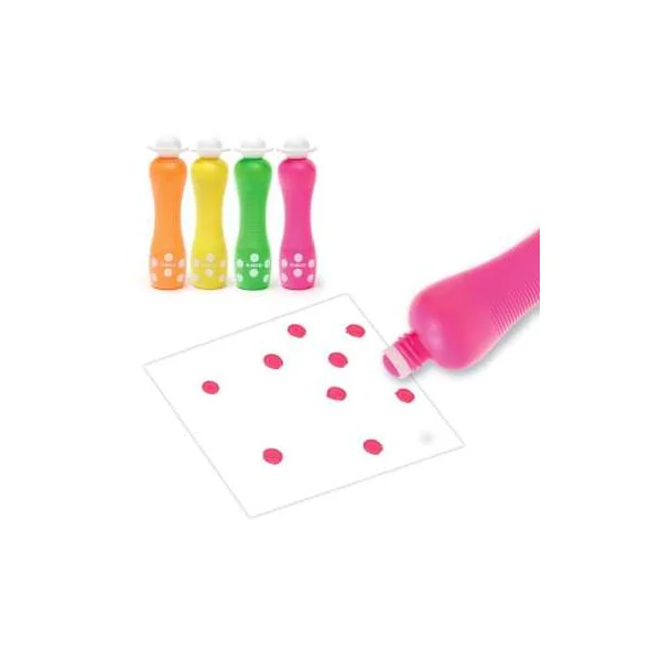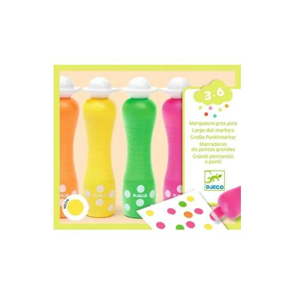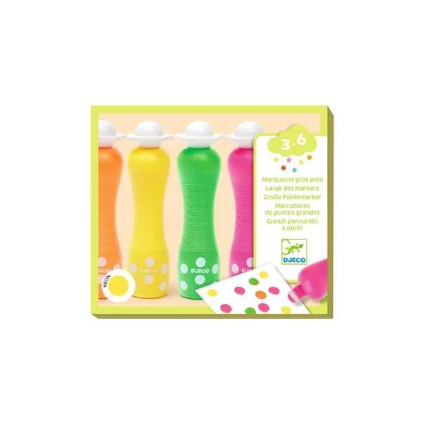 Découvrez les 4 marqueurs gros pois Néon de Djeco, un coffret composé de 4 gros marqueurs mousse permettant aux enfants de 3 à 6 ans de faire des points à effet fluo.
