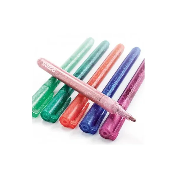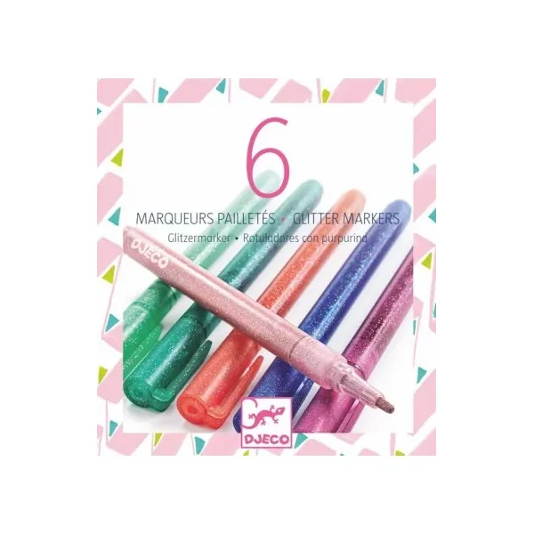Découvrez les 6 marqueurs pailletés sweet de Djeco, un set de 6 marqueurs avec des paillettes de couleur : rose, violet, bleu, rouge, vert foncé et vert clair, de beaux crayons pour embellir vos dessins à partir de 6 ans.