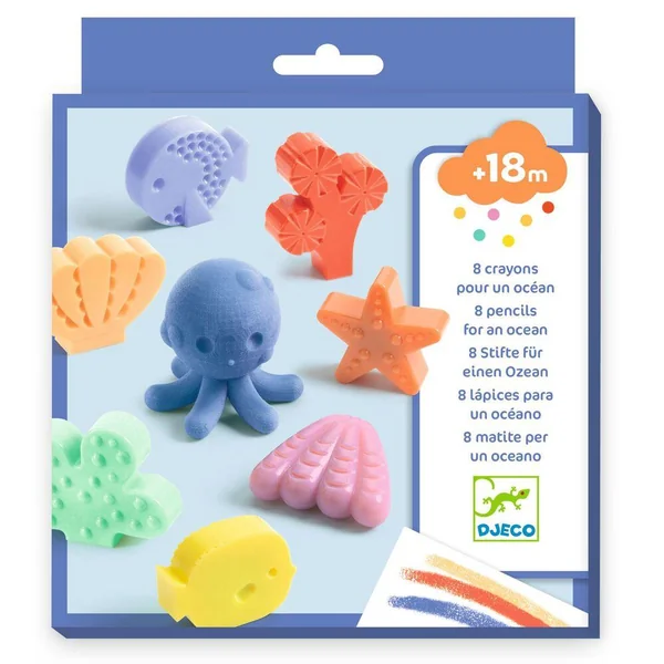 8 crayons pensés pour les petites mains. Des formes ludiques et rigolotes pour inventer un océan plein de vie : des crayons pour jouer, explorer et dessiner… sans aucune tache !