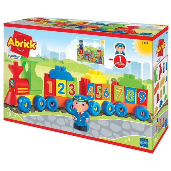 Un train à construire avec des briques décorées de chiffres et de lettres. 1 personnage inclus.