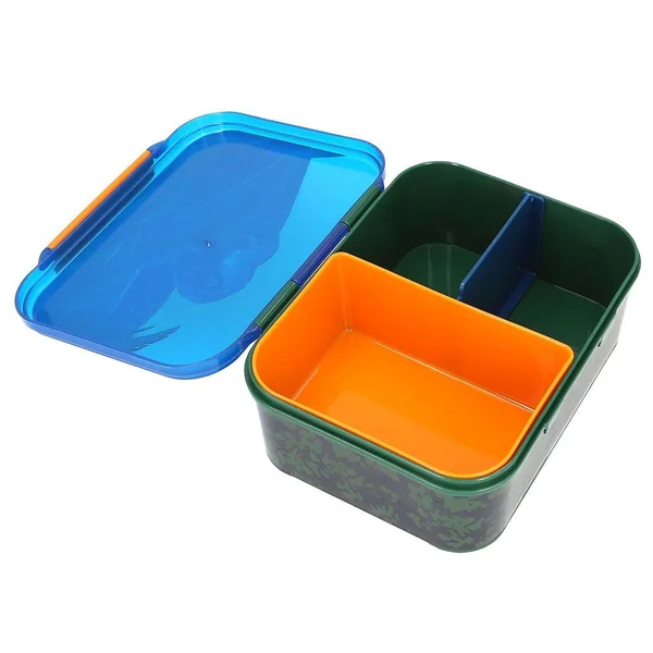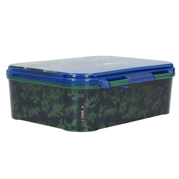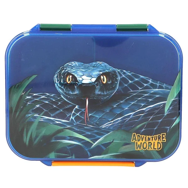 Adventure World Boîte à goûterSur le couvercle à charnière de cette boîte à goûter bleue et verte Adventure World, le regard fascinant d’un serpent noir retient l’attention. Avec de superbes détails orange, un compartiment intérieur amovible et un séparateur qui peut être placé à différents endroits. La boîte ne convient pas à une utilisation au micro-ondes. Matière principale : 100 % plastique (polypropylène), sans BPA et sans plastifiants-