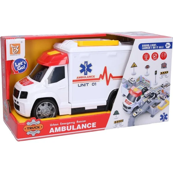 L’ambulance peut être dépliée en garage dans le complexe hospitalier, avec des petites voitures et des panneaux. Roues libres. Grand bouton sur le toit – déverrouillage de l’ambulance.