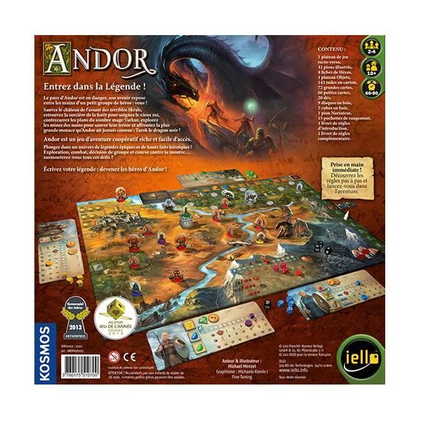 Entrez dans la Légende ! Le jeu d’aventure coopératif de Michael Menzel, lauréat de l’As d’Or-Jeu ! Le pays d’Andor est en danger, son avenir repose entre les mains d’un petit groupe de héros : vous ! Sauvez le château de l’assaut des terribles Skrals, retrouvez la sorcière de la forêt pour soignez le vieux roi Brandur, contrecarrez les plans du sombre mage Varkur, explorez les mines des nains pour sauver leur trésor et affrontez la plus grande menace qu’Andor ait jamais connue : Tarok le dragon noir ! Andor est un jeu d’aventure coopératif riche et facile d’accès qui vous plongera dans un univers de légendes épiques et de hauts faits héroïques. Exploration, combat, décision de groupe et course contre la montre ! Surmonterez-vous tous ces défis ? Écrivez votre légende : devenez les héros d’Andor !