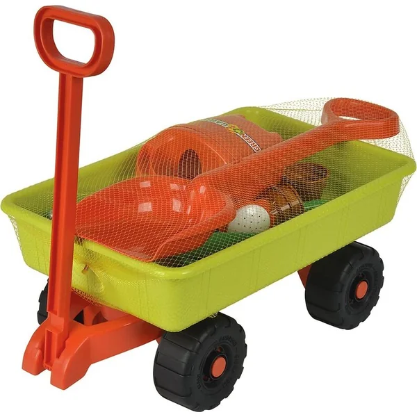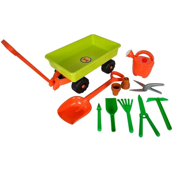 • Comprend : chariot, arrosoir de 0,5 litre, 4 petits pots de jardin, deux types de ciseaux de jardin, une truelle, une binette, un râteau et une petite pelle.