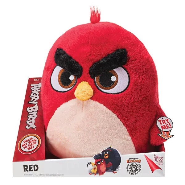 Peluche Red de 35.5 cm. Red est le personnage principal du jeu Angry Birds. De couleur rouge, c’est le chef des oiseaux. Si tu presses l’aile de Red, il émet du son.