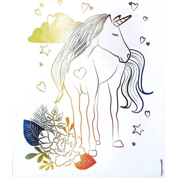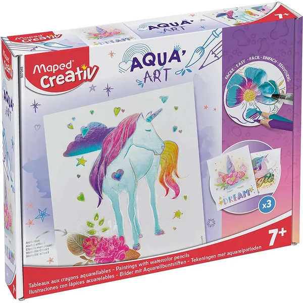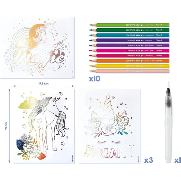 Un coffret qui associe crayons de couleur aquarellables et tableaux métallisés dans l’univers féérique des licornes-