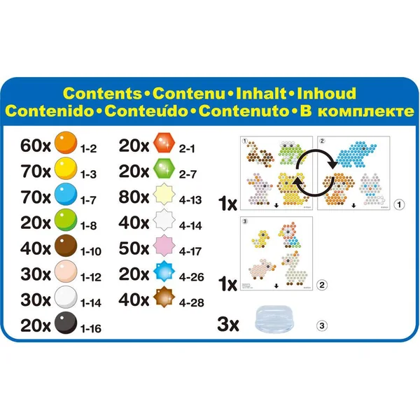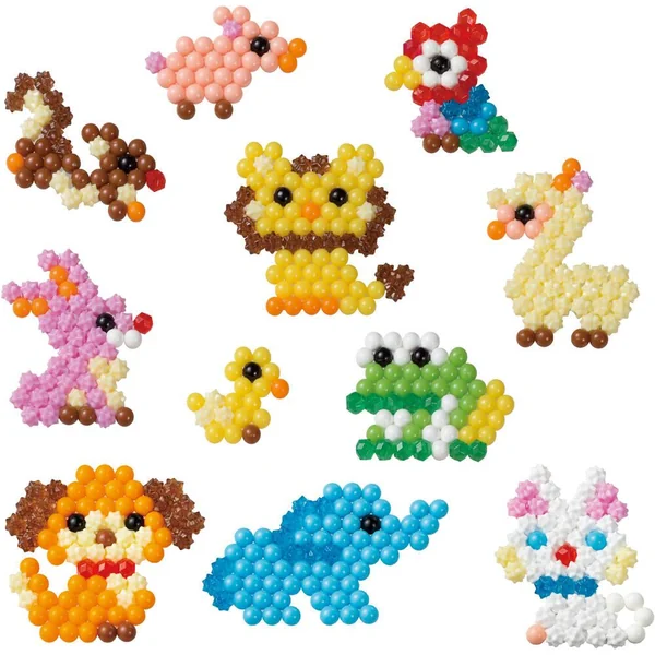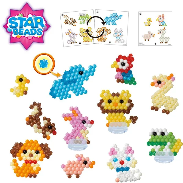 Le principe est simple : assemble les perles, vaporise de l’eau, laisse sécher et c’est prêt ! Avec perles de différentes formes (dont les perles étoiles) et couleurs, et l’essentiel pour des heures de créativité avec Aquabeads !
