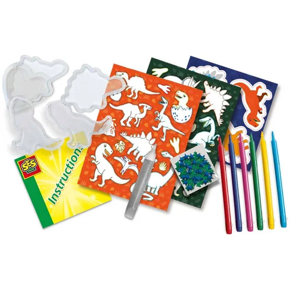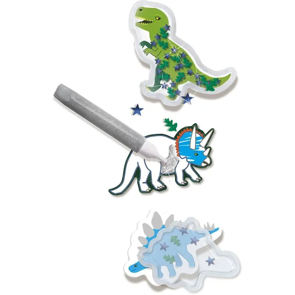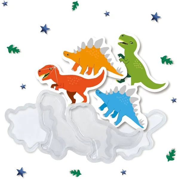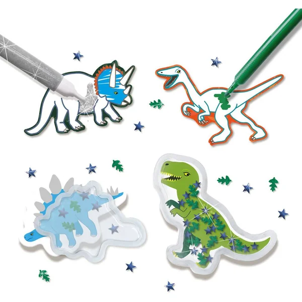 Dessine et crée tes propres autocollants de dinosaure. Colorie ton dinosaure, remplis-le de différentes paillettes et fixe la capsule dinosaure dessus. En plus des autocollants dinosaures, il contient également deux feuilles d’autocollants dinosaures. Tu peux les colorier avec les feutres et ajouter des décorations grâce à la colle à paillettes.