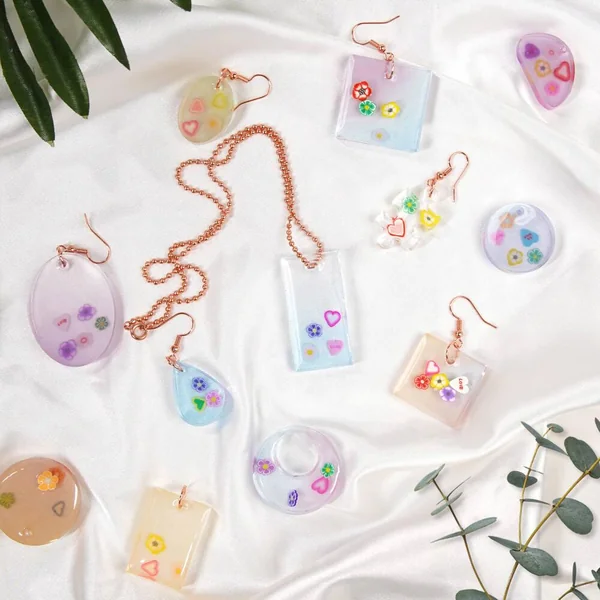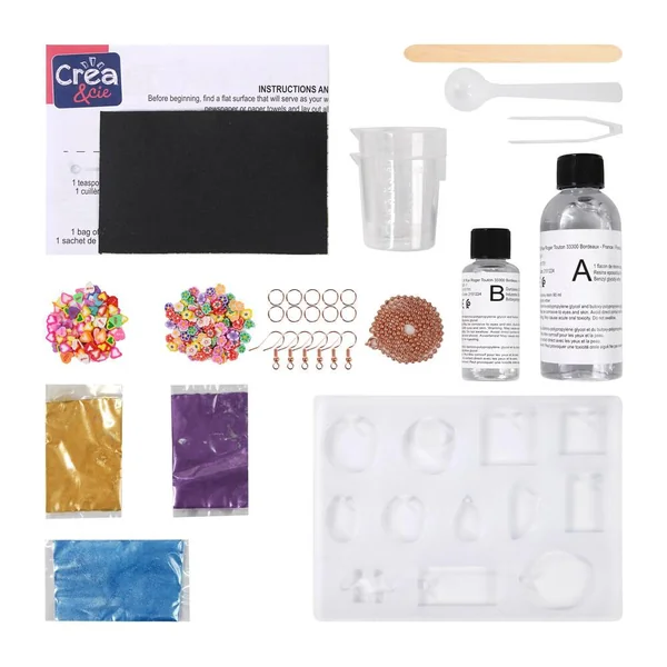 30 pièces au total. Fabrique tes propres colliers et boucles d’oreilles en résine. Fabrique plus de 20 bijoux. Tout ce dont tu as besoin pour commencer est inclus ! Crée tes propres bijoux en résine. Contenu : 1 flacon de résine époxy de 90 ml, 1 flacon de durcisseur de 30 ml, 1 moule en silicone, 3 sachets de poudre de mica, 1 collier en métal, 6 crochets pout boucles d’oreilles en métal, 10 anneaux ouverts en métal, 1 sachet de confettis en forme de fleur (3 g), 1 sachet de confettis en forme de cœur (3 g), 1 cuillère en plastique, 2 gobelets gradués, 1 bâton de mélange, 1 pince à épiler, 1 papier abrasif, et une feuille d’instructions