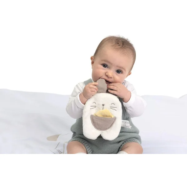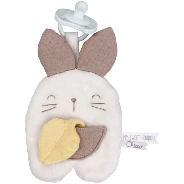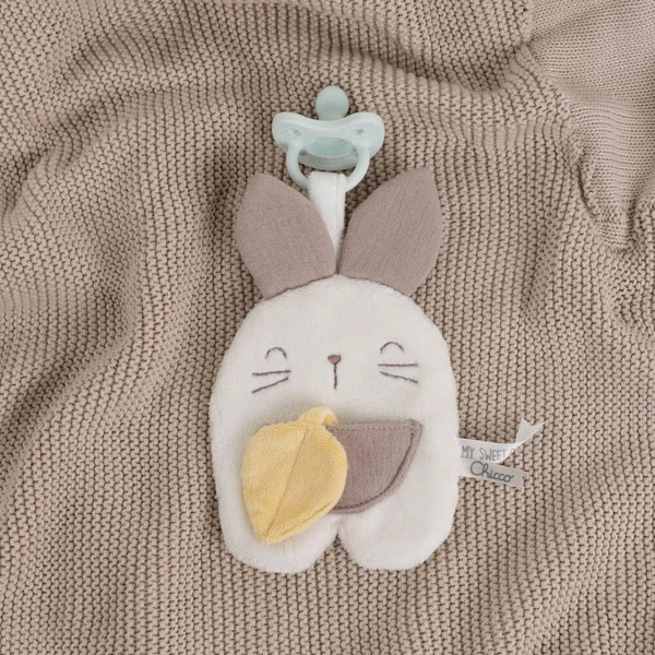 Doudou attache-sucette Lapin en velours doux et gaze de coton, pensé pour éveiller les sens de bébé grâce à ses différentes textures. Il cache du papier bruissant à l’intérieur et une petite feuille dissimulée dans sa poche, pour des moments de jeu et de découverte. Pratique : il passe en machine pour un nettoyage facile.