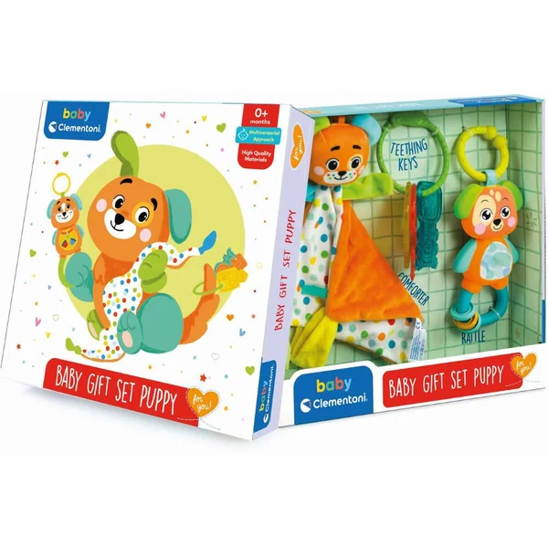 Un coffret avec tous les indispensables pour accueillir un nouveau-né de la meilleure des manières : un doudou tout doux, un hochet coloré et des clés en plastique souple à mordiller. Le hochet coloré est un petit chien avec des éléments en caoutchouc et un anneau pratique pour l’accrocher. Les clés souples favorisent la phase de dentition, tandis que le doudou est un ourson qui deviendra le premier compagnon de jeu de Bébé. Les couleurs vives, les effets bruissants, les éléments mobiles et les divers matériaux sont concus pour favoriser le développement multisensoriel de l’enfant.