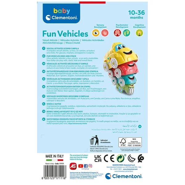 Designed, developed, and manufactured in Italy, the Baby Clementoni Fun Vehicles Sorting & Stacking Toys reflect a commitment to quality and safety. Each vehicle is made from durable, child-safe materials, ensuring that they can withstand the rigors of active play. Parents can rest assured knowing that their little ones are playing with a product that meets high safety standards while also being environmentally friendly.