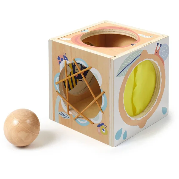 BabyBox est une boîte à cache-cache en bois naturel et aux couleurs pastel, destinée aux enfants à partir de 10 mois. L’enfant choisit l’un des trous pour cacher la balle à l’intérieur de la boîte : à travers les élastiques, en ouvrant la petite porte, en la passant à travers le tissu ou encore par le grand trou. Puis, il la récupère et recommence. L’enfant découvre 4 manières différentes de cacher la balle dans la boîte.