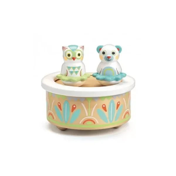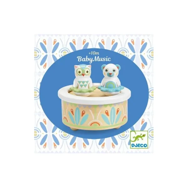 Découvrez la boite à musique BabyMusic de la collection « Baby White » de Djeco, une jolie boite à musique ronde en bois naturel avec deux mignons personnages pour éveiller ou endormir les bébés.
