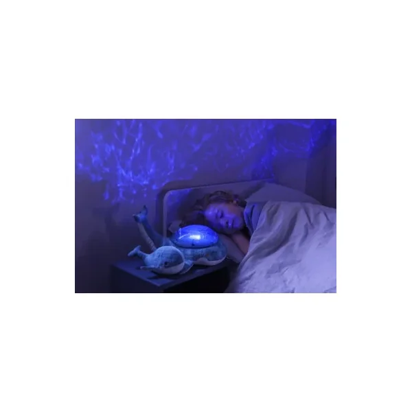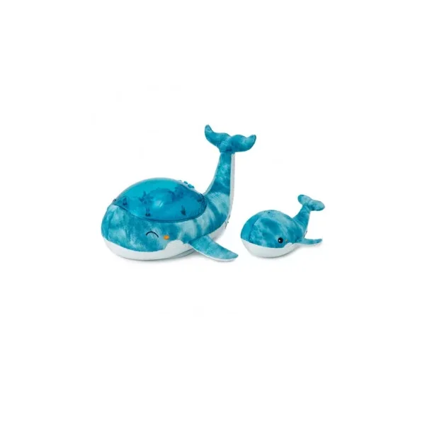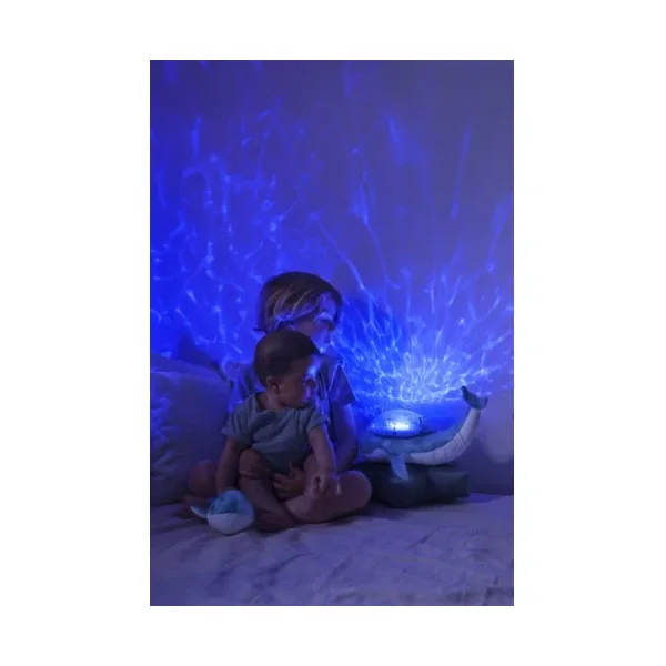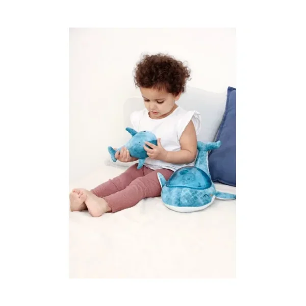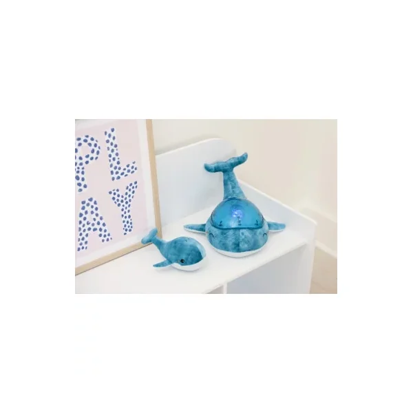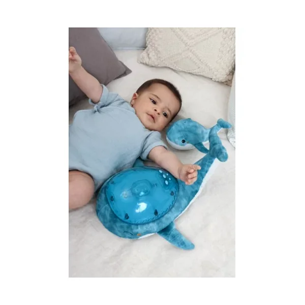 Découvrez lapeluche musicale à projections Tranquil whale blue family de Cloud b, une peluche toute douce en forme de baleine qui projette au plafond des jeux de lumière sous-marins et s’accompagnent d’une douce mélodie aux sonorités subaquatiques ou du bruit des vagues. Elle s’accompagne d’un joli hochet baleine pour éveiller les bébés.