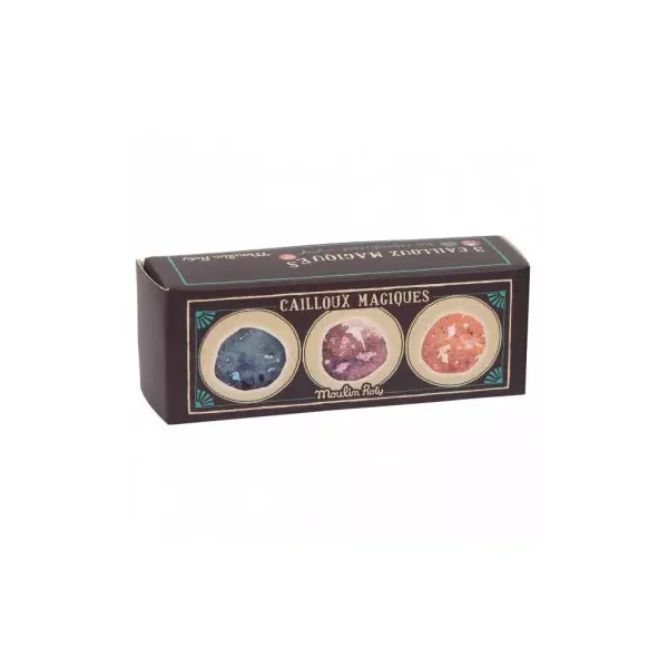 Découvrez les balles rebondissantes cailloux magiques de la collection Les petites merveilles de Moulin Roty, 3 balles en caoutchouc de couleur rose, gris et orange qui font penser à des pierres précieuses.
