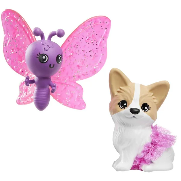 Barbie aux longs cheveux noirs (18cm) porte une jupe en tulle violet et fuchsia à volants, parsemée d’étoiles. 2 animaux et 3 accessoires sont inclus.