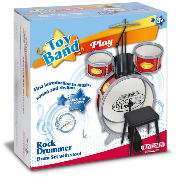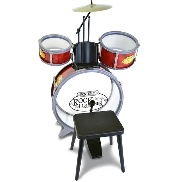 Batterie composée d’une grosse caisse de 38.5 cm de diamètre, de deux tons et d’une cymbale, et livrée avec deux baguettes et un tabouret.