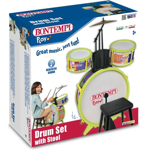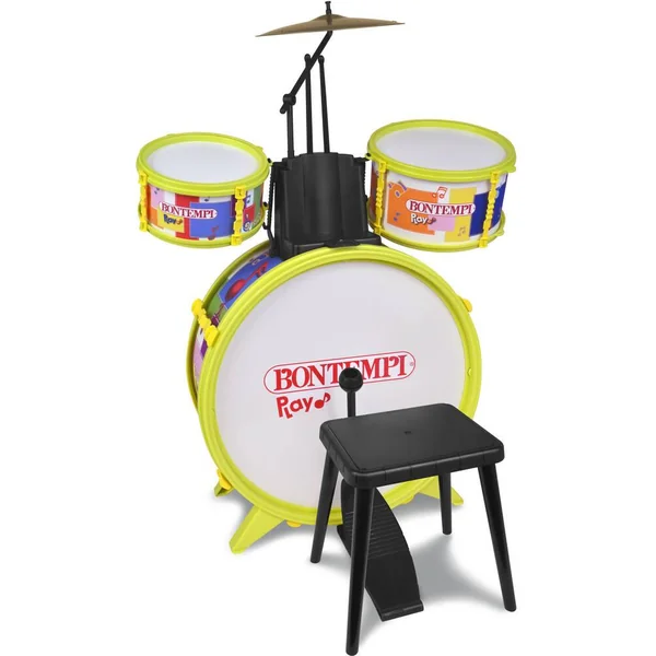 Batterie: grosse caisse Ø 385 mm avec pédale • 2 toms Ø 170 et 210 mm • Cymbale Ø 210 mm • 2 baguettes • Sons réels • Livrée avec tabouret • Dim: 500x500x680 mm-
