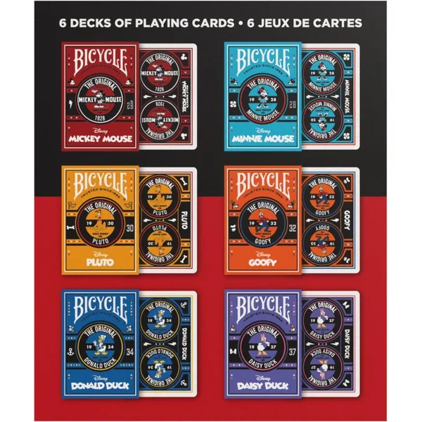 Retrouvez la magie des personnages iconiques avec le coffret Bicycle Disney Classiques ! Ce coffret collector réunit 6 jeux de cartes entièrement personnalisés, chacun dédié à un héros emblématique de l’univers Disney : Mickey, Minnie, Donald, Daisy, Goofy et Pluto. Chaque jeu met en scène son personnage dans un style unique, joyeux et intemporel, idéal pour tous les âges. Un coffret parfait à offrir, pensé pour rassembler toute la famille autour de parties pleines de nostalgie et de bonne humeur. Un hommage aux figures légendaires de Disney. Ce coffret contient 6 jeux de cartes. CARACTÉRISTIQUES: