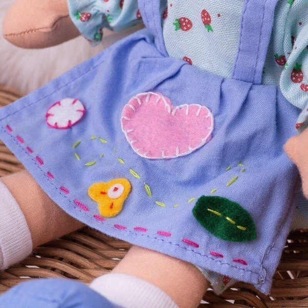 Rencontrez Grace – une poupée en tissu joyeuse et colorée avec laquelle votre enfant adorera jouer. La poupée est habillée d’un vêtement de qualité dans un joli ton bleu clair avec un motif de fraises rouges.