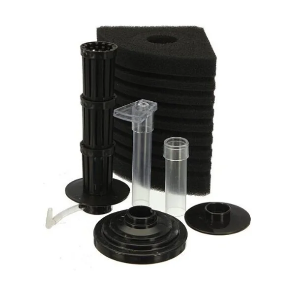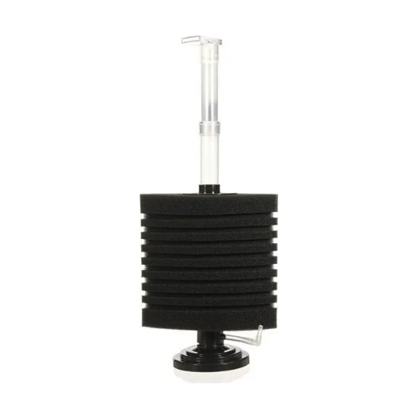 Possibilité de régler la hauteur des bulles à volonté. La hauteur totale du filtre peut varier entre 29 et 36 cm. Connexion du tuyau par le haut.