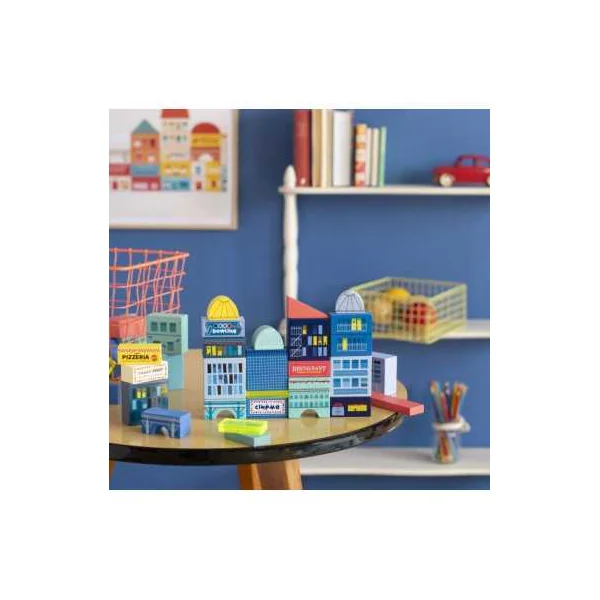 Grâce aux blocs en bois représentant des habitations, des toits, des enseignes de magasins, des ponts… votre enfant s’amusera à créer sa propre ville composée d’immeubles, de commerces, de restaurants, d’un cinéma, d’un bowling…