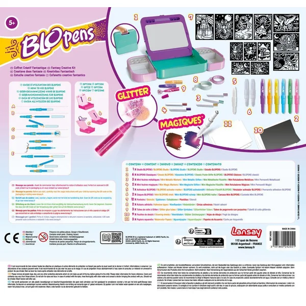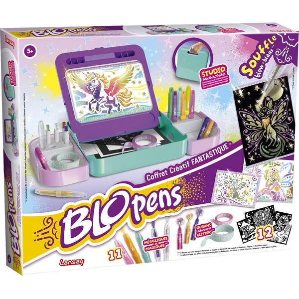 Place ton pochoir sur le chevalet, utilise tes Blopens classiques, métalliques et magiques, et réalise des dessins époustouflants. Rajoute des rubans adhésifs imprimés pour créer ton propre univers de rêve et des diamants colorés pour plus d’éclat et de brillance dans ton univers. C’est tellement amusant !