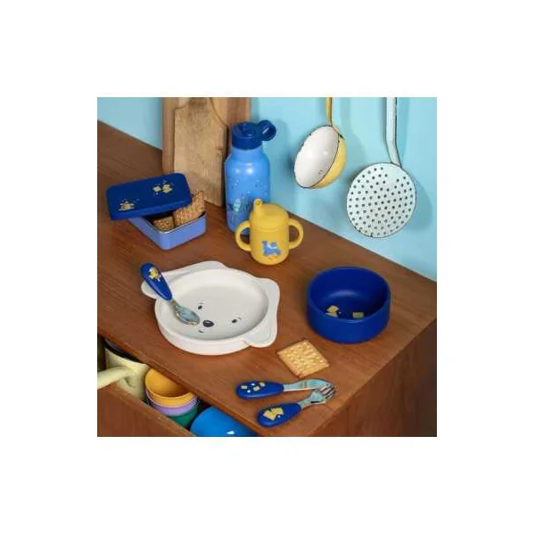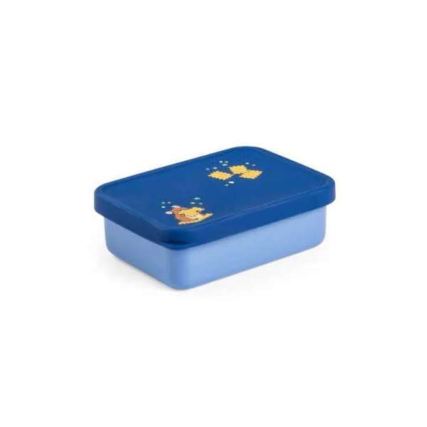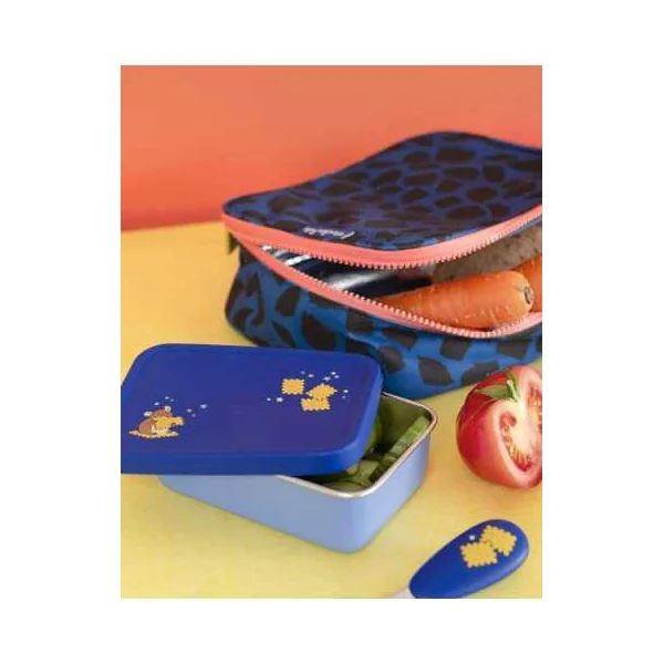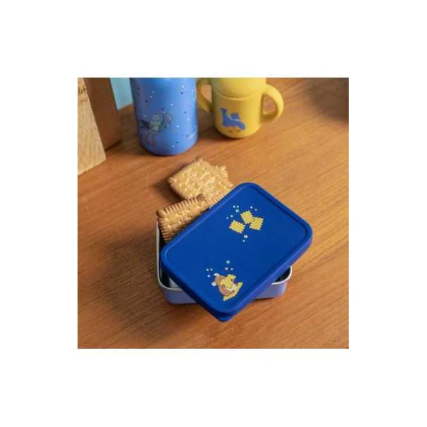 Fabriquée en inox de qualité, elle se distingue par son couvercle bleu en silicone joliment illustré. Cette boîte résistante est idéale pour transporter les petits en-cas des enfants lors des sorties, à l’école ou pendant les promenades.