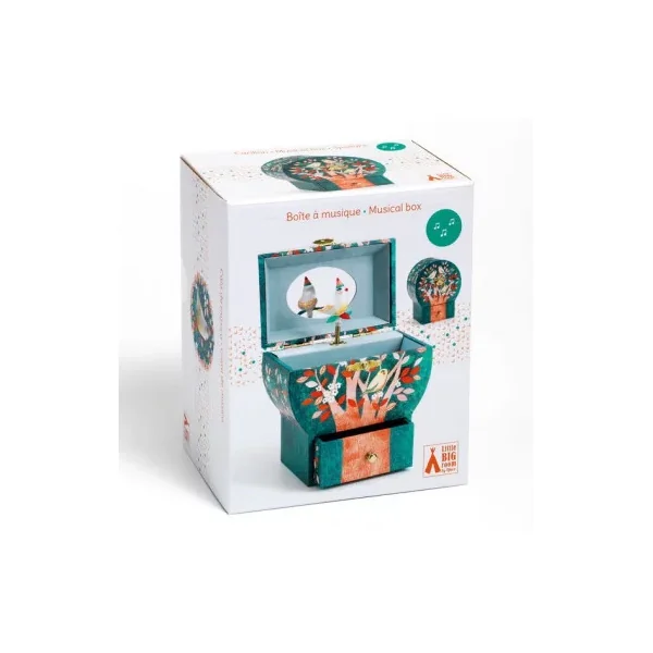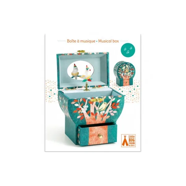 Une jolie boite à musique Djeco avec un grand compartiment pour ranger tout ses trésors et un tiroir pour ses secrets. Votre fille s’admirera devant le miroir et regardera danser l’oiseau qui s’animera en musique à l’ouverture de la boite.