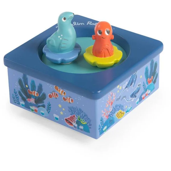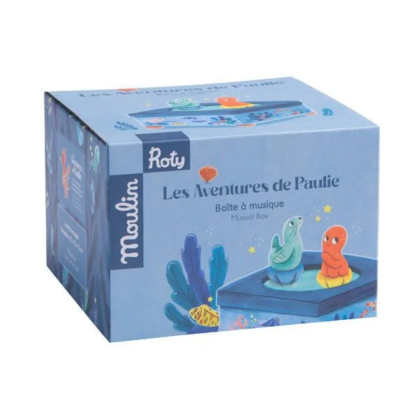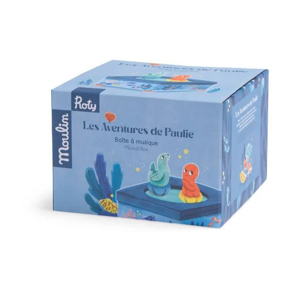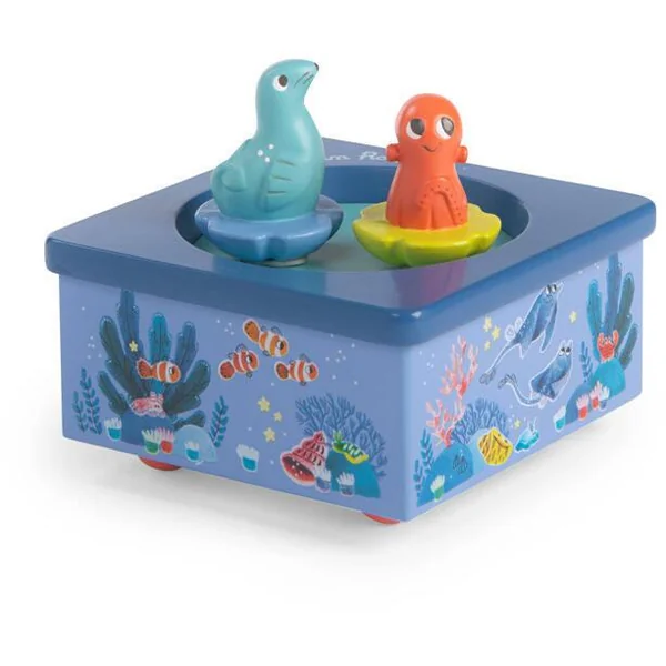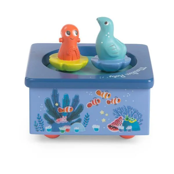 Bienvenue sous l’océan avec cette boîte à musique illustrée aux couleurs des fonds marins. Paulie le pouple et son amie Émilie l’otarie tournent et dansent sur la piste pour bercer et endormir bébé.