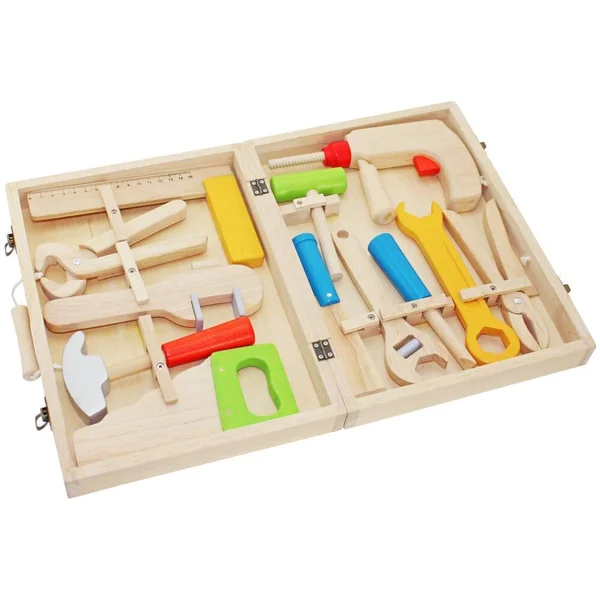 Boîte en bois avec 12 outils dont une perceuse, une équerre graduée de 15 cm, un marteau, une scie, un tournevis, une clef à molette, une clé plate, une pince et une tenaille. Boîte à outils avec poignée, dimensions fermée : 33 x 25 x 7 cm. Dimensions de la perceuse : 18 x 2,5 x 10 cm. Léger et facile à manipuler, ce jeu permet le développement de l’imaginaire et l’apprentissage des objets.