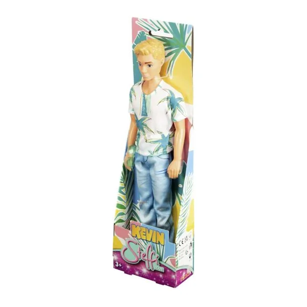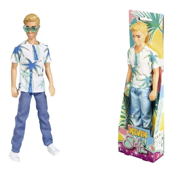 Le petit bonhomme Kevin en tenue de vacances. Habillé d’un t-shirt avec un palmier et de cool jeans avec des lunettes de soleil.