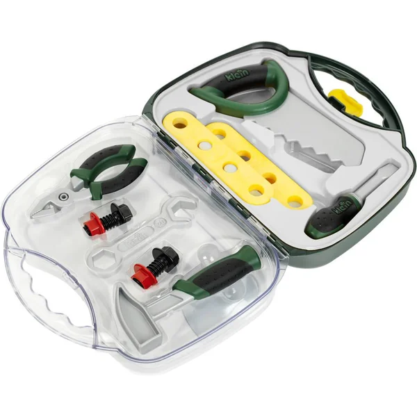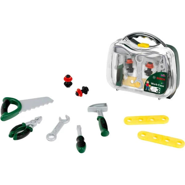 MALLETTE OUTILS BOSCH Cette mallette transparente BOSCH contient les accessoires de bricolage suivants : – scie – pince – marteau – clé à molette – vis – écrous – lattes – tournevis Mallette idéale pour faire ses premiers pas dans le monde du bricolage !