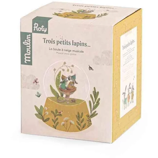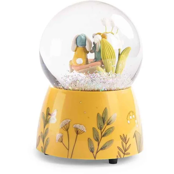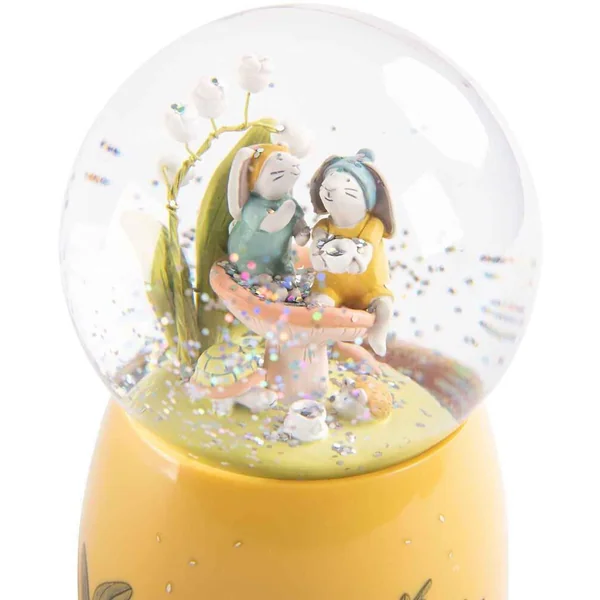 Boule à neige représentant 2 petits lapins et leurs amis. Les voilà au jardin, au milieu des paillettes holographiques, partageant le thé, assis sur un champignon ! En plus de décorer la chambre, une jolie mélodie viendra bercer bébé au moment du coucher…
