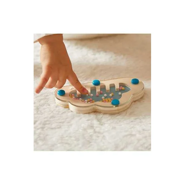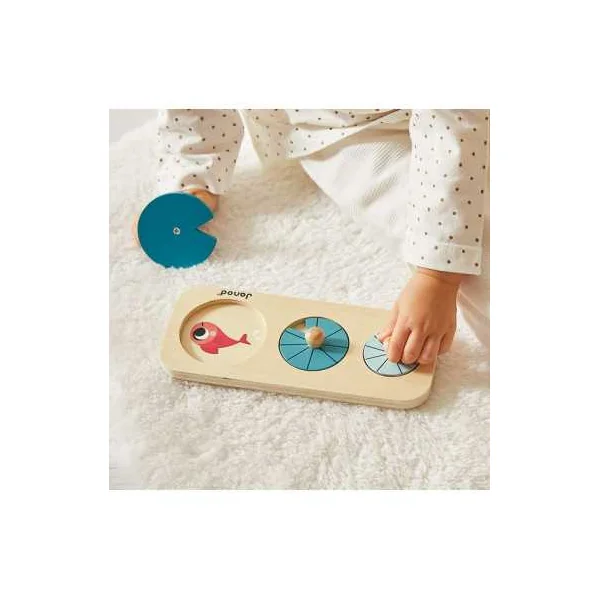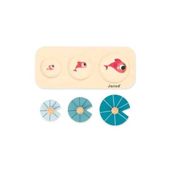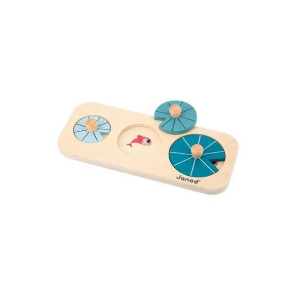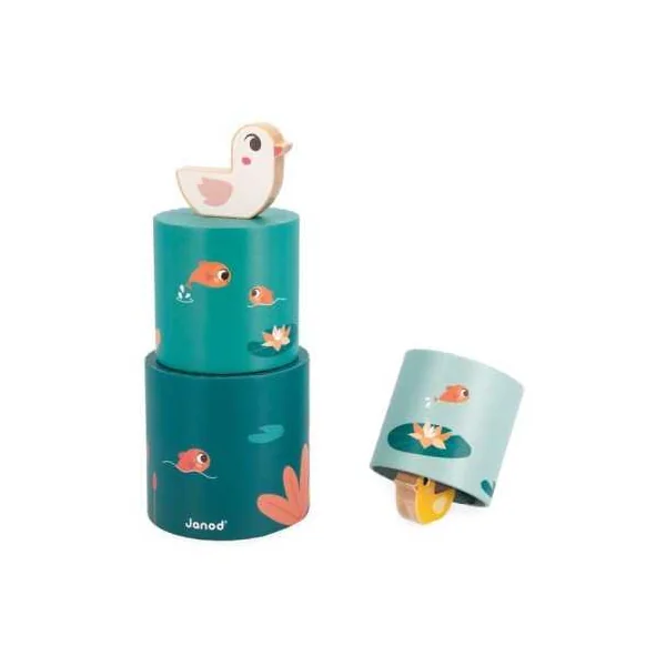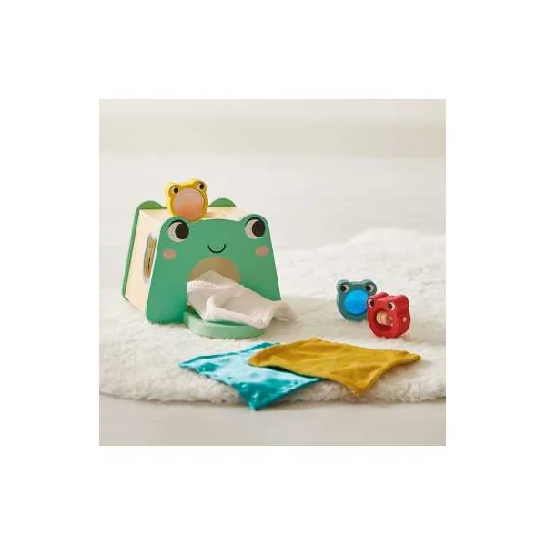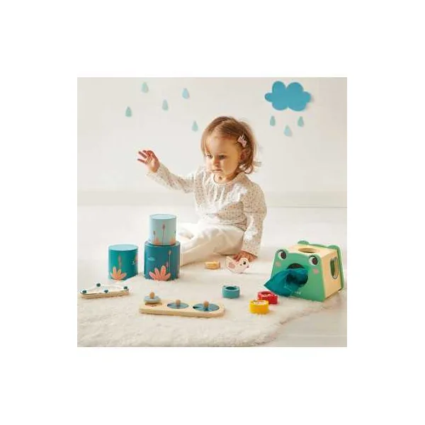 En ouvrant cette belle boite colorée, vous trouverez un bâton de pluie en forme de nuage, un puzzle à encastrer avec des pièces à tenons en forme de nénuphars, des cubes à empiler de forme ronde avec des figurines canards Chunky et une boite à formes sensorielle avec 3 grenouilles à encastrer possédant chacune une fonction sensorielle différente (vitre colorée, miroir, perles). Cette boite en forme de grenouille renferme également 3 tissus aux textures différentes, que votre enfant pourra récupérer grâce à une trappe avec plan incliné.