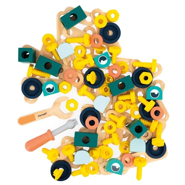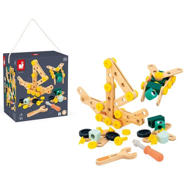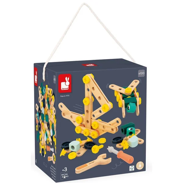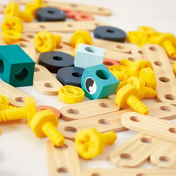 Pour les petits bricoleurs en herbe, à l’imagination débordante, ce set de construction de 100 pièces sera parfait ! Il se compose de 100 pièces : 28 plaquettes, 8 roues, 6 rondelles, 4 yeux, 10 blocs en bois, 10 boulons, 14 inserts, 18 vis, 1 tournevis et 1 clé. Afin de se familiariser avec les différents assemblages, et guider votre enfant pour ses premières constructions, 10 cartes modèles sont incluses. Pratique, ce joli baril peut être emmené partout grâce à sa ficelle en coton ! Petit plus, les vis sont équipées de cran pour ajouter un peu plus de jouabilité et de difficulté. Jouet en bois et carton FSCTM. Jouet d’imitation pour les enfants à partir de 3 ans. Lors de la création de notre gamme Brico’Kids, nous avons fait le choix d’imaginer une nouvelle visserie, unique, qui apporte une signature forte aux produits tout en améliorant grandement la fonctionnalité des outils. Robots et animaux amènent une touche de sympathie à cette collection joyeusement colorée.