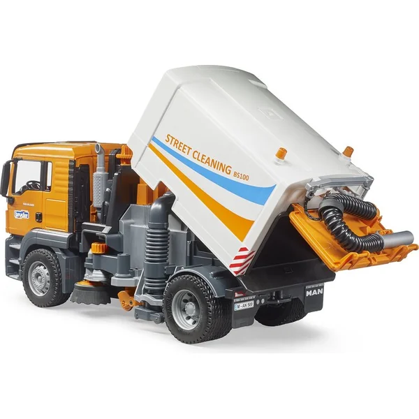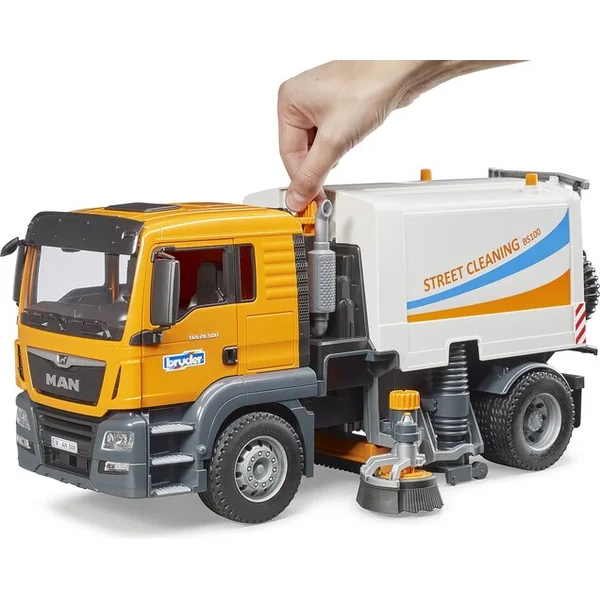 Comme tous les modèles Bruder, celui-ci est également équipé de nombreuses fonctionnalités – deux brosses rotatives et réglables en hauteur peuvent nettoyer sans problème, et une longue brosse qui se déplace lorsque le véhicule avance aide également. Vous débarrasserez la ville des salissures grâce à un tuyau d’aspiration flexible à l’arrière du véhicule MAN TGS. Les déchets ramassés peuvent être facilement vidés en soulevant le conteneur basculant, puis le couvercle arrière s’ouvre et les déchets se déversent à l’endroit prévu.