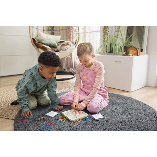Jouet didactique pour les enfants à partir de 4 ans, avec lequel les garçons et les filles s’amuseront. Les enfants assemblent des formes géométriques et des images selon des modèles à l’aide de élastiques de différentes longueurs et de pinces. Ou laissez libre cours à votre imagination et inventez vos propres motifs. Le jouet convient aussi bien aux enfants d’âge préscolaire qu’aux enfants d’âge scolaire.