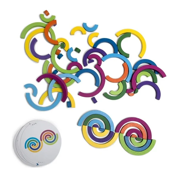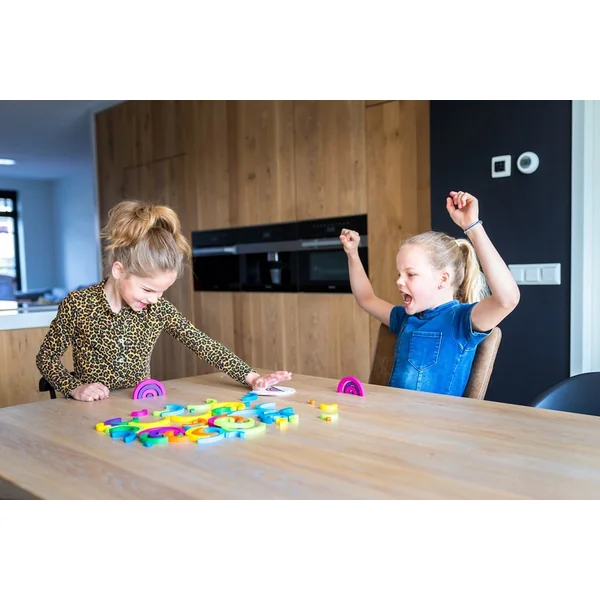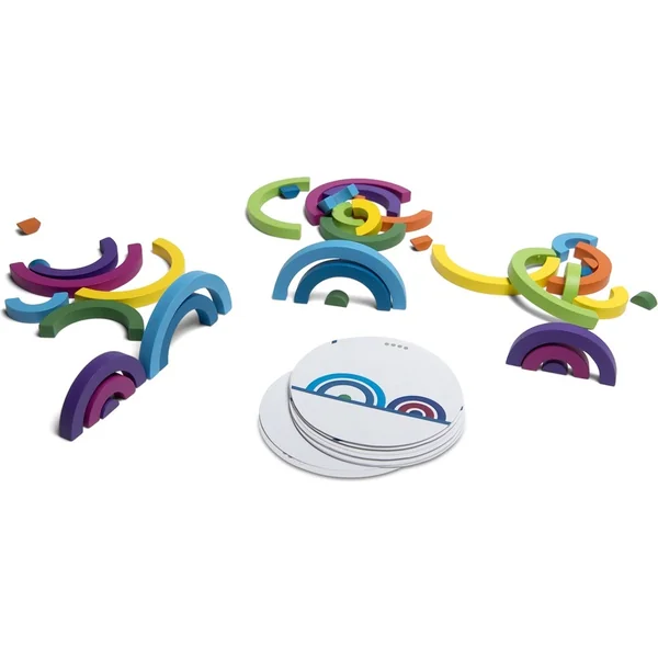 Chaque joueur reçoit un ensemble de pièces colorées en arc-en-ciel et sa tâche est de reproduire l’image qu’il voit sur la carte devant lui. Celui qui crée correctement la copie de l’image en premier gagne la carte ! Ce jeu teste qui a la meilleure combinaison d’imagination spatiale, de coordination et de rapidité.