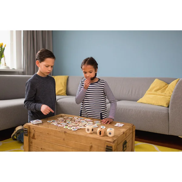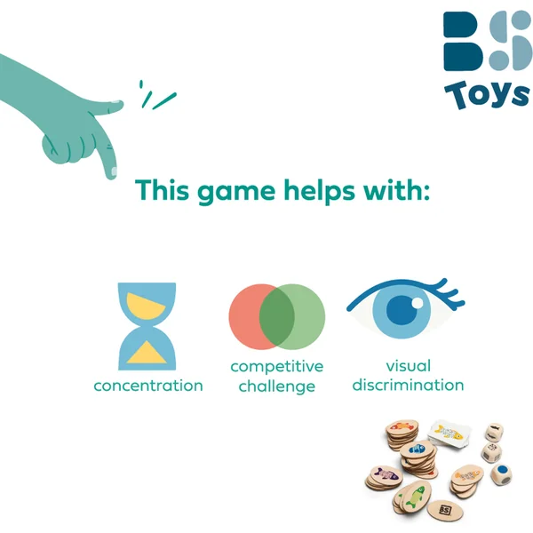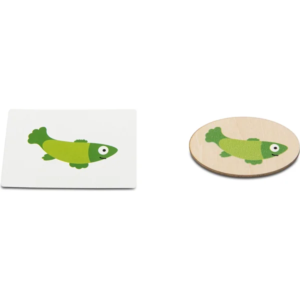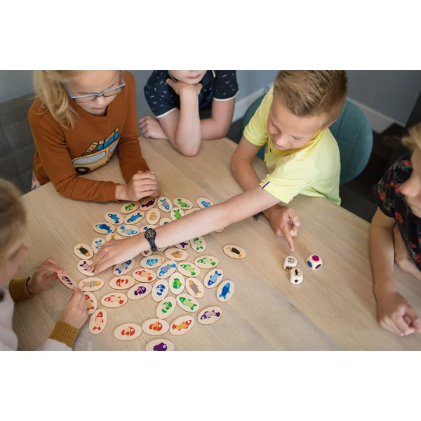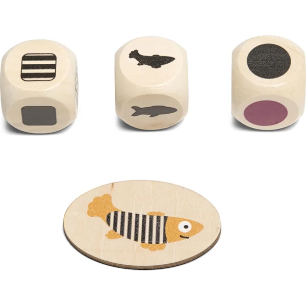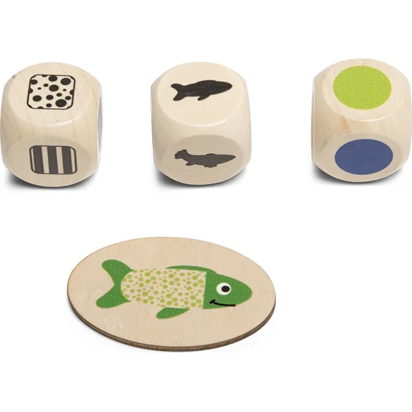 Jeu logique et d’observation pour 2 à 4 joueurs à partir de 4 ans. Lancez trois dés et trouvez le poisson avec la bonne forme, couleur et motif. Le résultat du lancer de dés est une combinaison de caractéristiques. Par exemple, vous cherchez un poisson rond avec un motif à pois verts. Qui sera le plus rapide ? Si le jeu est trop compliqué pour les jeunes enfants, rangez les dés et utilisez les cartes. Qui trouvera le poisson sur la carte en premier ? Plusieurs options de jeu signifient que vous ne vous ennuierez pas dans ce jeu !