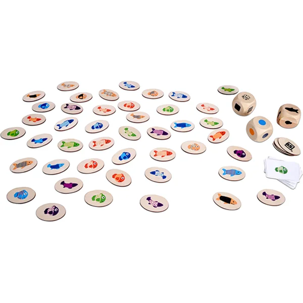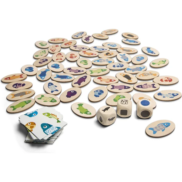 Le jeu contient : 54 petits poissons, 6 x 4 x 2,6 cm, 54 cartes, 7,5 x 5,5 cm, 3 dés de jeu.