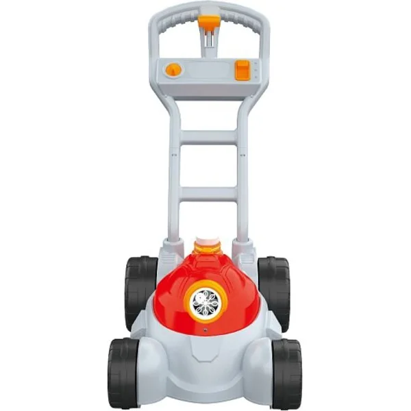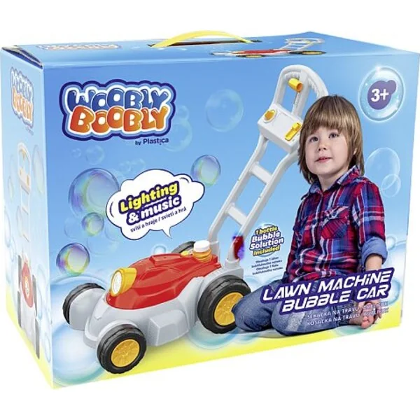 Tondeuse à bulles avec effets lumineux et sonores. Vissez la solution à bulles fournie au bas de la tondeuse et appuyez sur le bouton. Vous verrez une multitude de bulles magiques s’échapper de l’avant de la tondeuse à moteur. Appuyez une deuxième fois et vous aurez également un accompagnement musical.