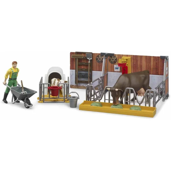 Echelle 1:16. Coffret fermier Bworld avec figurine et animaux : vache et veau. Une figurine fermier et accessoires : brouette, seau… Bworld est l’univers du jeu de Bruder. Il s’agit de figurines, d’animaux et d’accessoires mobiles et, plus récemment, de kits thématiques répartis dans les collections bien connues de Bruder ici dans la gamme de l’univers agricole. Ce kit thématique Bworld étable, vache et veau comprend une étable moderne pour la vache, avec une mangeoire et des brosses. Le veau est en sécurité dans son box, muni d’un seau pour lui permettre de boire. Les deux animaux sont soignés de manière optimale par l’agriculteur compris, qui les nourrit et assure le nettoyage de l’étable avec les brouettes et accessoires fournis. Tous les éléments de décors Bworld peuvent être combinés entre eux. Age recommandé : à partir de 4 ans pour l’intérieur et l’extérieur. Fabriqué en plastiques de qualité, par ex. ABS. Dimensions de la figurine fermier seule : 3.5 x 1.8 x 10.7 cm.