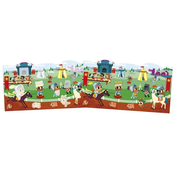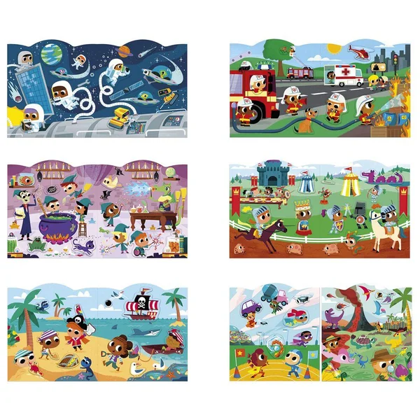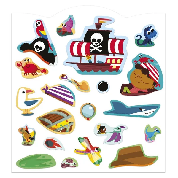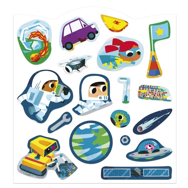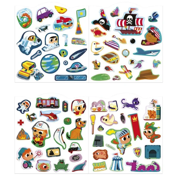 À l’aventure ! Ce cahier silhoueté se compose de 12 pages de décors illustrés sur la thématique des aventuriers : astronautes, pirates, pompiers … à compléter à l’aide des 8 pages d’autocollants soit 70 au total. Les emplacements des autocollants sont en couleur descendue pour aider l’enfant à les identifier. Chaque autocollant à une forme simple pour faliciter la préhension, sans débord. Ils se collent et se décollents facilement et sont présentés en planches agrafées dans le cahier. Cette activité permet de développer sa patience et sa motricité fine.