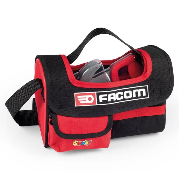 Caisse à outils en tissu Facom avec plusieurs rangements, une poignée et une sangle réglable pour la porter sur l’épaule.